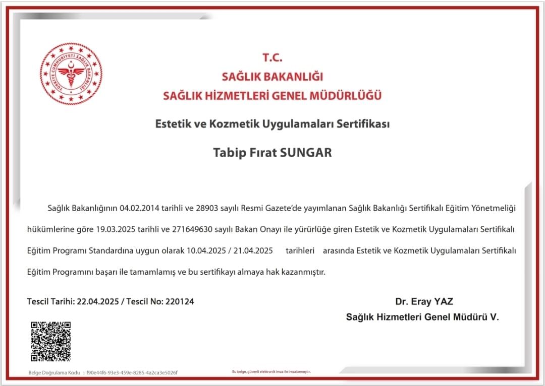 Dr. Fırat Sungar, 1984 yılında Mardin’de doğmuş olup eğitim hayatına Körfez Fen Lisesi’nde başlamıştır. Tıp eğitimine Gülhane Askeri Tıp Akademisi’nde devam eden Dr. Sungar, lisans eğitimini İstanbul Üniversitesi Cerrahpaşa Tıp Fakültesi’nde tamamlayarak mesleki temelini güçlendirmiştir. 2011 yılında Kocaeli Devlet Hastanesi’nde başlayan hekimlik yolculuğu, 2013 yılından itibaren Medikal Estetik ve Tamamlayıcı Tıp alanlarına yoğunlaşarak uzmanlık düzeyinde ilerlemiştir. 2020 yılından bu yana Dr. Fırat Sungar Muayenehanesi’nde hastalarını kabul etmektedir.