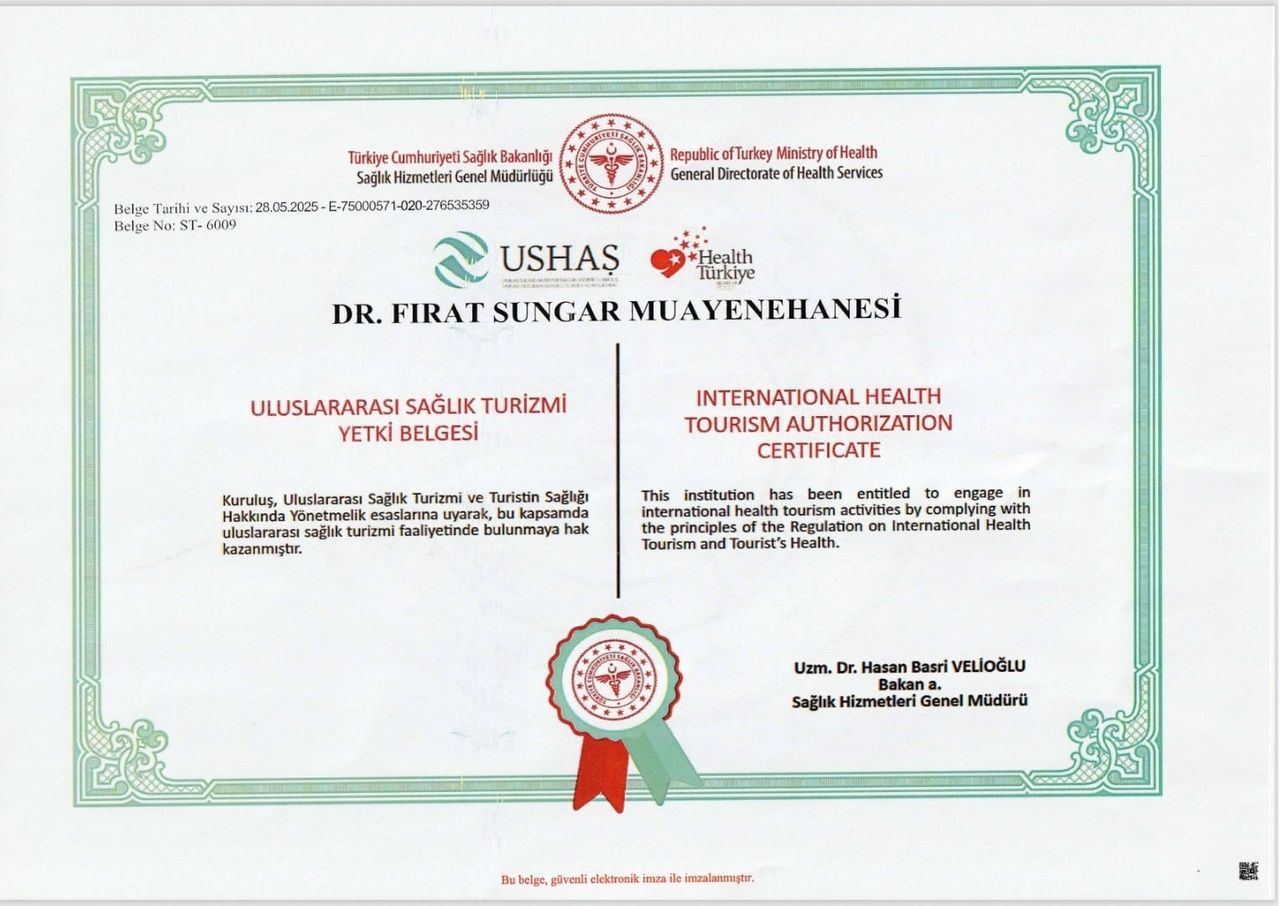 Muayenehanesi, Uluslararası Sağlık Turizmi Yetki Belgesi’ne sahip olup hem Türkiye’den hem de çeşitli ülkelerden gelen danışanlara uluslararası standartlarda, güvenilir ve etik sağlık hizmeti sunmaktadır.